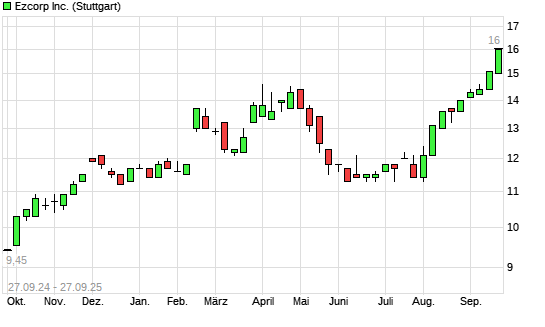 Mit dem Anstieg auf 15,70 EUR hat die Ezcorp-Aktie (ISIN US3023011063) am 26.09.2025 ein neues 10-Jahres-Hoch erreicht und damit den Kurs vom 25.09.2025 eingestellt.