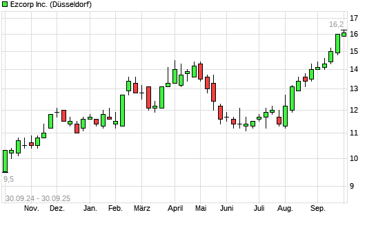 Mit dem Anstieg auf 16,00 EUR hat die Ezcorp-Aktie (ISIN US3023011063) am 29.09.2025 ein neues 10-Jahres-Hoch erreicht und damit den Kurs vom 26.09.2025 eingestellt.