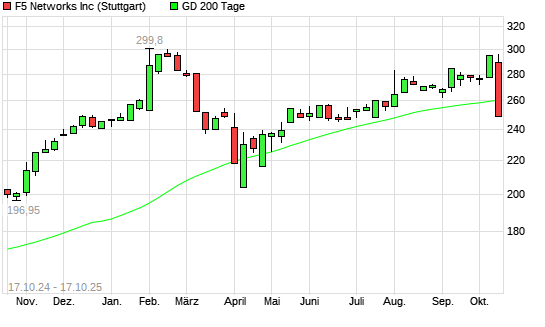 Mit dem Rücksetzer auf 248,80 EUR hat die F5 Networks-Aktie am 16.10.2025 die 200-Tage-Linie nach unten gekreuzt.