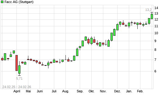 Mit dem Anstieg auf 12,86 EUR hat die FACC-Aktie (ISIN AT00000FACC2) am 23.02.2026 ein neues 5-Jahres-Hoch erreicht und damit den Kurs vom 20.02.2026 eingestellt.