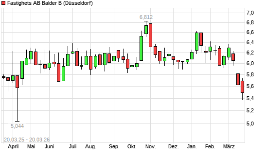 Mit dem Rücksetzer auf 5,45 EUR hat die FASTIG.AB BALDER B-Aktie (ISIN SE0017832488) am 19.03.2026 ein neues 6-Monats-Tief erreicht und damit den Kurs vom 13.03.2026 eingestellt.
