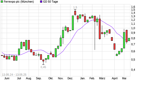 Mit dem Anstieg auf 0,85 EUR hat die FERREXPO-Aktie am 12.05.2025 die 50-Tage-Linie nach oben gekreuzt.