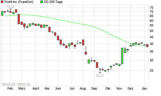 Mit dem Rücksetzer auf 37,54 EUR hat die FIVE9-Aktie am 08.01.2025 die 200-Tage-Linie nach unten gekreuzt.