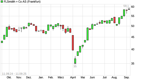Mit dem Anstieg auf 59,10 EUR hat die FLSmidth-Aktie (ISIN DK0010234467) am 10.09.2025 ein neues 10-Jahres-Hoch erreicht und damit den Kurs vom 06.06.2018 eingestellt.