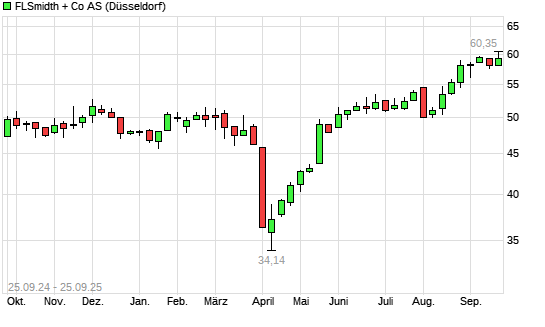 Mit dem Anstieg auf 59,95 EUR hat die FLSmidth-Aktie (ISIN DK0010234467) am 24.09.2025 ein neues 10-Jahres-Hoch erreicht und damit den Kurs vom 12.09.2025 eingestellt.