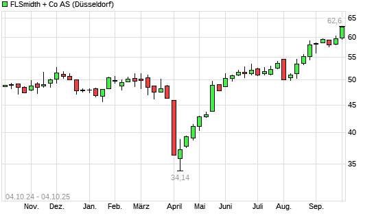 Mit dem Anstieg auf 60,95 EUR hat die FLSmidth-Aktie (ISIN DK0010234467) am 03.10.2025 ein neues 10-Jahres-Hoch erreicht und damit den Kurs vom 02.10.2025 eingestellt.