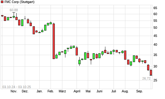Mit dem Rücksetzer auf 26,61 EUR hat die FMC-Aktie (ISIN US3024913036) am 02.10.2025 ein neues 5-Jahres-Tief erreicht und damit den Kurs vom 30.09.2025 eingestellt.