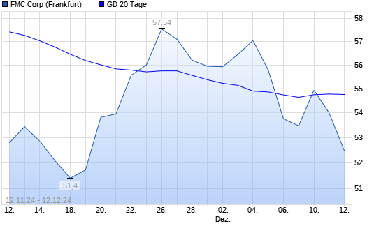 Mit dem Rücksetzer auf 54,00 EUR hat die FMC-Aktie am 11.12.2024 die 20-Tage-Linie nach unten gekreuzt.