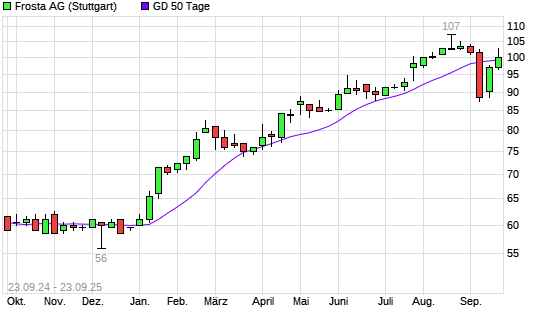 Mit dem Anstieg auf 100,00 EUR hat die FRoSTA-Aktie am 22.09.2025 die 50-Tage-Linie nach oben gekreuzt.