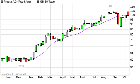 Mit dem Rücksetzer auf 98,80 EUR hat die FRoSTA-Aktie am 09.10.2025 die 50-Tage-Linie nach unten gekreuzt.Die FRoSTA-Aktie befindet sich seit dem 10.01.2025 im langfristigen Aufwärtstrend ...weiterlesen