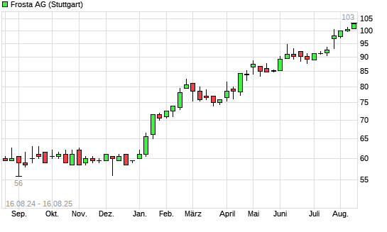 Mit dem Anstieg auf 103,00 EUR hat die FRoSTA-Aktie (ISIN DE0006069008) am 15.08.2025 ein neues All-Time-High erreicht und damit den Kurs vom 13.08.2025 eingestellt.Die ...weiterlesen