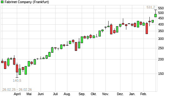 Mit dem Anstieg auf 531,20 EUR hat die Fabrinet-Aktie (ISIN KYG3323L1005) am 25.02.2026 ein neues All-Time-High erreicht und damit den Kurs vom 24.02.2026 eingestellt.
