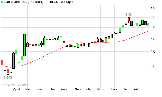 Mit dem Rücksetzer auf 4,80 EUR hat die Faes Farma-Aktie am 26.02.2026 die 100-Tage-Linie nach unten gekreuzt.