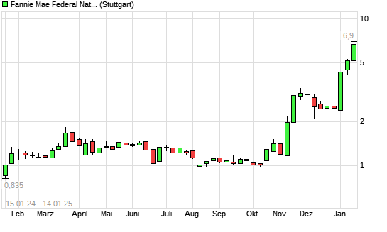 Mit dem Anstieg auf 5,30 EUR hat die Fannie Mae-Aktie (ISIN US3135861090) am 13.01.2025 ein neues 10-Jahres-Hoch erreicht und damit den Kurs vom 06.01.2025 eingestellt.