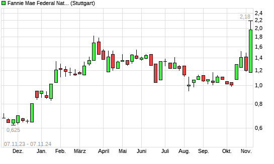 Mit dem Anstieg auf 1,64 EUR hat die Fannie Mae-Aktie (ISIN US3135861090) am 06.11.2024 ein neues 6-Monats-Hoch erreicht und damit den Kurs vom 24.10.2024 eingestellt.