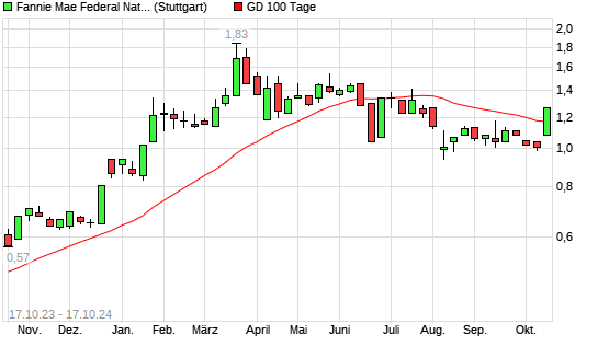 Mit dem Rücksetzer auf 1,19 EUR hat die Fannie Mae-Aktie am 16.10.2024 die 100-Tage-Linie nach unten gekreuzt.