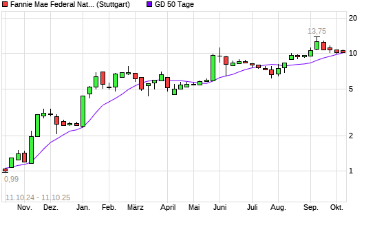 Mit dem Rücksetzer auf 10,20 EUR hat die Fannie Mae-Aktie am 10.10.2025 die 50-Tage-Linie nach unten gekreuzt.