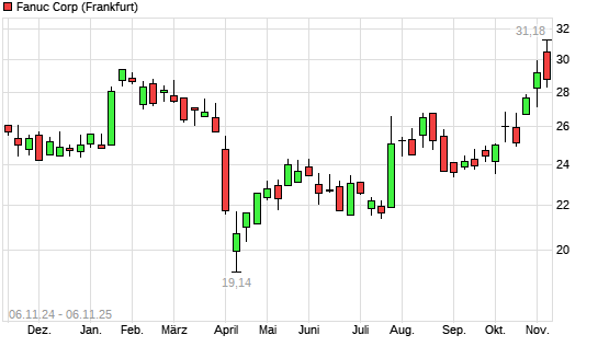 Mit dem Anstieg auf 30,00 EUR hat die Fanuc-Aktie (ISIN JP3802400006) am 05.11.2025 ein neues 12-Monats-Hoch erreicht und damit den Kurs vom 03.11.2025 eingestellt.