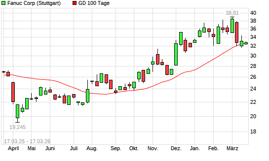 Mit dem Rücksetzer auf 32,50 EUR hat die Fanuc-Aktie am 16.03.2026 die 100-Tage-Linie nach unten gekreuzt.