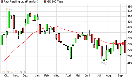 Mit dem Anstieg auf 280,60 EUR hat die Fast Retailing-Aktie am 18.09.2025 die 100-Tage-Linie nach oben gekreuzt.