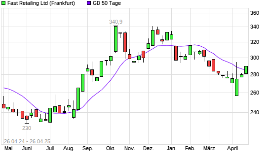 Mit dem Anstieg auf 289,70 EUR hat die Fast Retailing-Aktie am 25.04.2025 die 50-Tage-Linie nach oben gekreuzt.