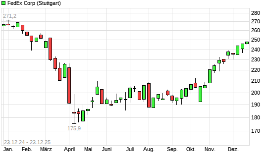 Mit dem Anstieg auf 245,85 EUR hat die FedEx-Aktie (ISIN US31428X1063) am 22.12.2025 ein neues 6-Monats-Hoch erreicht und damit den Kurs vom 18.12.2025 eingestellt.