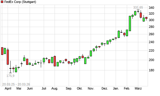 Mit dem Anstieg auf 332,90 EUR hat die FedEx-Aktie (ISIN US31428X1063) am 19.03.2026 ein neues All-Time-High erreicht und damit den Kurs vom 04.03.2026 eingestellt.