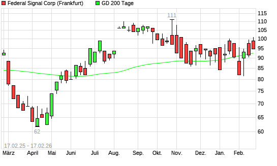 Mit dem Anstieg auf 99,00 EUR hat die Federal Signal Corporation-Aktie am 16.02.2026 die 200-Tage-Linie nach oben gekreuzt.
