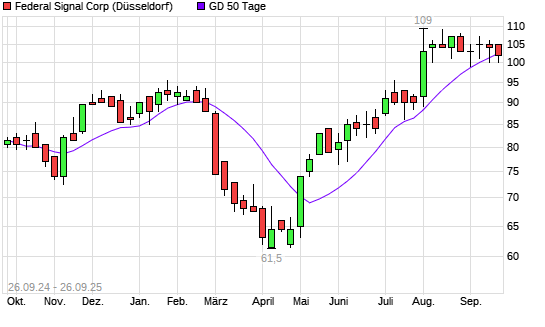 Mit dem Rücksetzer auf 97,50 EUR hat die Federal Signal Corporation-Aktie am 25.09.2025 die 50-Tage-Linie nach unten gekreuzt.