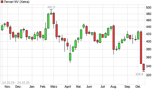 Mit dem Rücksetzer auf 329,50 EUR hat die Ferrari-Aktie (ISIN NL0011585146) am 13.10.2025 ein neues 12-Monats-Tief erreicht und damit den Kurs vom 10.10.2025 eingestellt.