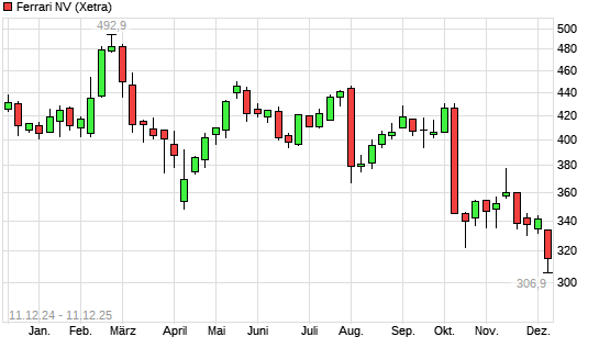 Mit dem Rücksetzer auf 311,50 EUR hat die Ferrari-Aktie (ISIN NL0011585146) am 10.12.2025 ein neues 12-Monats-Tief erreicht und damit den Kurs vom 09.12.2025 eingestellt.
