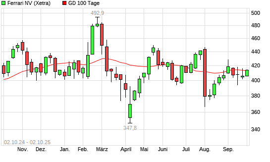 Mit dem Anstieg auf 415,00 EUR hat die Ferrari-Aktie am 01.10.2025 die 100-Tage-Linie nach oben gekreuzt.