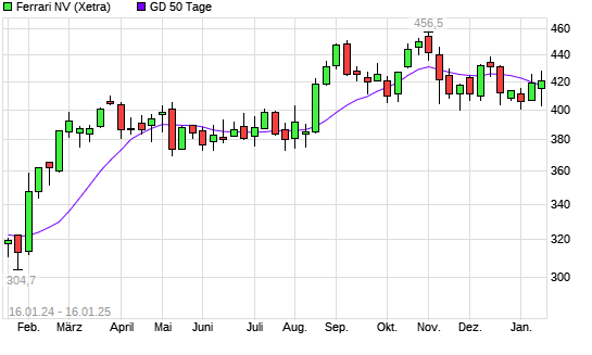 Mit dem Anstieg auf 418,90 EUR hat die Ferrari-Aktie am 15.01.2025 die 50-Tage-Linie nach oben gekreuzt.