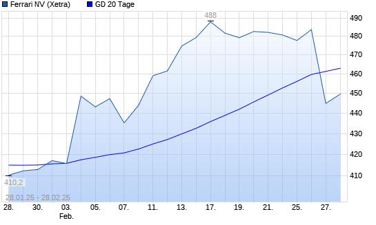 Mit dem Rücksetzer auf 445,00 EUR hat die Ferrari-Aktie am 27.02.2025 die 20-Tage-Linie nach unten gekreuzt.