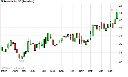 Mit dem Anstieg auf 42,86 EUR hat die Ferrovial-Aktie (ISIN NL0015001FS8) am 17.02.2025 ein neues All-Time-High erreicht und damit den Kurs vom 13.02.2025 eingestellt.