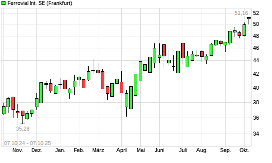 Mit dem Anstieg auf 50,26 EUR hat die Ferrovial-Aktie (ISIN NL0015001FS8) am 06.10.2025 ein neues All-Time-High erreicht und damit den Kurs vom 03.10.2025 eingestellt.