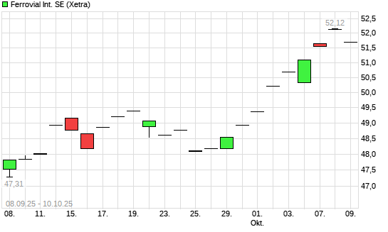 Mit dem Anstieg auf 52,34 EUR hat die Ferrovial-Aktie (ISIN NL0015001FS8) am 09.10.2025 ein neues All-Time-High erreicht und damit den Kurs vom 08.10.2025 eingestellt.