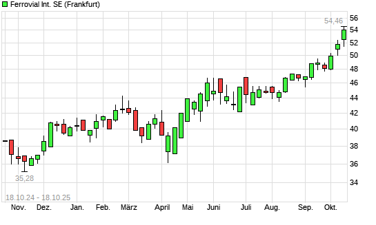 Mit dem Anstieg auf 54,08 EUR hat die Ferrovial-Aktie (ISIN NL0015001FS8) am 17.10.2025 ein neues All-Time-High erreicht und damit den Kurs vom 13.10.2025 eingestellt.
