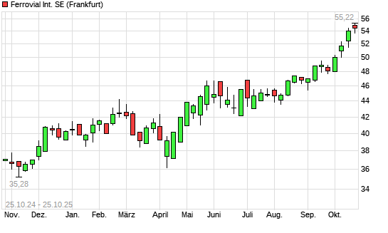 Mit dem Anstieg auf 54,48 EUR hat die Ferrovial-Aktie (ISIN NL0015001FS8) am 24.10.2025 ein neues All-Time-High erreicht und damit den Kurs vom 23.10.2025 eingestellt.