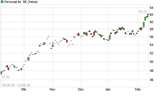 Mit dem Anstieg auf 62,04 EUR hat die Ferrovial-Aktie (ISIN NL0015001FS8) am 11.02.2026 ein neues All-Time-High erreicht und damit den Kurs vom 10.02.2026 eingestellt.Die Ferrovial-Aktie befindet ...weiterlesen
