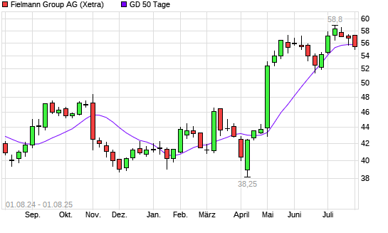 Mit dem Rücksetzer auf 55,30 EUR hat die Fielmann-Aktie am 31.07.2025 die 50-Tage-Linie nach unten gekreuzt.