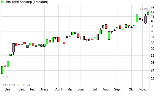 Mit dem Anstieg auf 44,06 EUR hat die Fifth Third Bancorp-Aktie (ISIN US3167731005) am 12.11.2024 ein neues 10-Jahres-Hoch erreicht und damit den Kurs vom 17.01.2022 eingestellt.