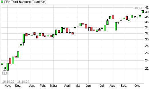 Mit dem Anstieg auf 40,43 EUR hat die Fifth Third Bancorp-Aktie (ISIN US3167731005) am 15.10.2024 ein neues 12-Monats-Hoch erreicht und damit den Kurs vom 14.10.2024 eingestellt.