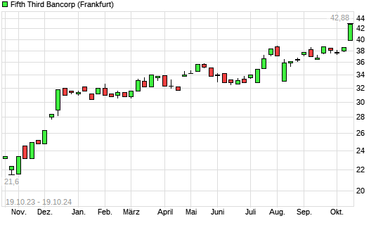 Mit dem Anstieg auf 42,88 EUR hat die Fifth Third Bancorp-Aktie (ISIN US3167731005) am 18.10.2024 ein neues 12-Monats-Hoch erreicht und damit den Kurs vom 17.10.2024 eingestellt.