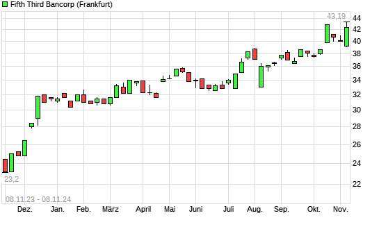 Mit dem Anstieg auf 43,19 EUR hat die Fifth Third Bancorp-Aktie (ISIN US3167731005) am 07.11.2024 ein neues 12-Monats-Hoch erreicht und damit den Kurs vom 18.10.2024 eingestellt.