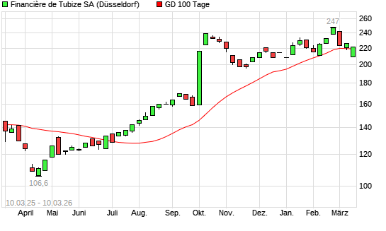 Mit dem Anstieg auf 221,50 EUR hat die Financière de Tubize-Aktie am 09.03.2026 die 100-Tage-Linie nach oben gekreuzt.