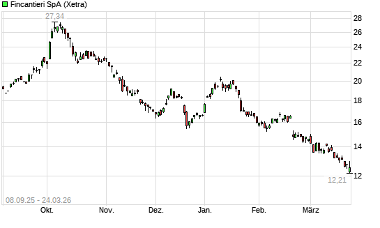 Mit dem Rücksetzer auf 12,46 EUR hat die Fincatieri-Aktie (ISIN IT0005599938) am 23.03.2026 ein neues 6-Monats-Tief erreicht und damit den Kurs vom 20.03.2026 eingestellt.