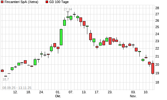 Mit dem Rücksetzer auf 18,77 EUR hat die Fincatieri-Aktie am 12.11.2025 die 100-Tage-Linie nach unten gekreuzt.