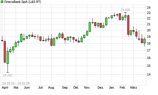 Mit dem Rücksetzer auf 17,77 EUR hat die FinecoBank-Aktie (ISIN IT0000072170) am 23.03.2026 ein neues 6-Monats-Tief erreicht und damit den Kurs vom 07.10.2025 eingestellt.