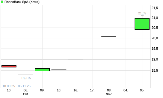 Mit dem Anstieg auf 21,00 EUR hat die FinecoBank-Aktie (ISIN IT0000072170) am 06.11.2025 ein neues All-Time-High erreicht und damit den Kurs vom 05.11.2025 eingestellt.